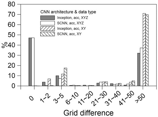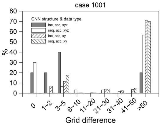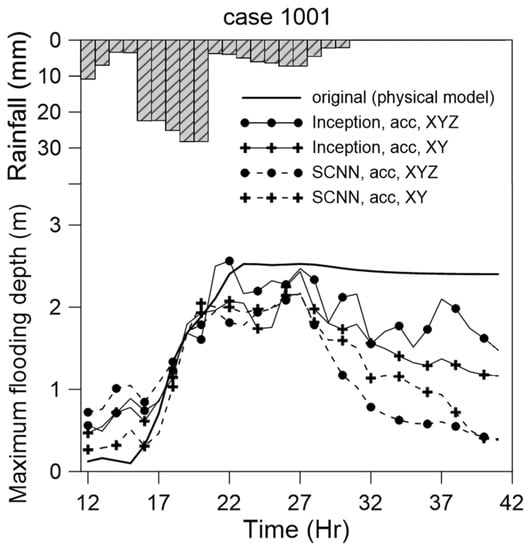 The statistics for the grid difference in the position at which the maximum flooding depth occurred (Figure 16) indicate that the optimal result was the grid difference of 5 or smaller in approximately 70% of cases when using the Inception architecture with accumulated rainfall data containing XYZ coordinates. For this same model, the difference was greater than 50 for approximately 20% of the grids. The reason is that the location at which flooding is the greatest is relatively uncertain at the beginning of flooding, and the depth of this flooding is extremely small, as illustrated in Figure 12. The second optimal result was obtained using the SCNN architecture and the accumulated rainfall data containing XYZ coordinates. For the other conditions, the grid difference was considerable. This result indicated the considerable accuracy of the flooding location predictions obtained using deep learning. We concluded that the Inception architecture and the use of accumulated rainfall data containing XYZ information generated the optimal model.