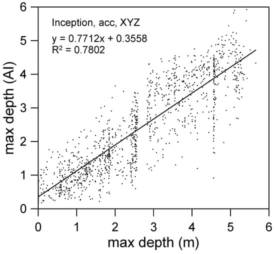 The similarity results indicated that the optimal model was that obtained when the accumulated rainfall data containing XYZ information was input into the Inception architecture. Figure 13 presents a comparison of the maximum flooding depth predicted by this optimal model with the actual data. The plot shows an excellent linear relationship; R2 is 0.78, but the regression line does not pass through the origin. A small value is present in the non-flooded area in the two-dimensional flooding-prediction map (and the minimum flooding depth in space). Thus, a numerical offset may exist in the deep learning regression result. The value shift may be due to the data sampling because we almost did not sample non-flooding data. The data for the first 11 h of each event, with little rain and no flooding, were not selected.