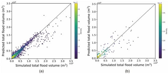 The total flooding volume in 1447 training data and 155 unused training data was compared with the result predicted using the AI model. Because of the excessive amount of data, the probability distribution function with the Gaussian distribution function as the kernel function to clarify the density of data [].