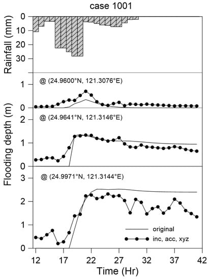 Both CNN model architectures used two types of rainfall data, namely collocated coordinate, and elevation information, to generate different models. The rainfall data that corresponded to the earliest time point were those obtained in the 12th h (t = −11) before the time point of interest (t = 0). If all the hourly rainfall distribution data were used, the rainfall data occupied 12 CNN channels. When the number of channels is high, considerable computer and GPU memory are consumed. In general, digital image recognition datasets, the size of each image is 20 × 20 or 28 × 28 pixels, and the number of parameters is 4010 []; in addition, 60,000 and 10,000 images are employed for training and testing, respectively. The size of each map used in the present study was 360 × 201, which is approximately 92 times that of 28 × 28. When 12 h were considered, the number of single rainfall data reached 1107 times of a 28 × 28 pixels image. If a more extended period of rainfall is investigated in future studies, more memory will be required. Therefore, this study did not use all the rainfall data at each hour but instead used the data for some specific hours. Theoretically, relatively recent rainfall has a major impact on a flooding situation. Strategically, we thus did not sample rainfall data from a prior long period too densely and not too sparsely because the total accumulated rainfall was essential.