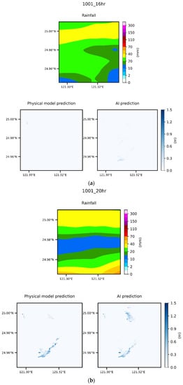 Two-dimensional results obtained using the Inception architecture and accumulated rainfall data containing XYZ information in comparison with the physical model results at time points of (a) 16; (b) 20; (c) 28; and (d) 40 h.
