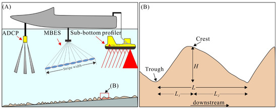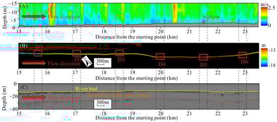Field observations were made in the South Channel (Figure 1C). Measurements along the channel thalweg approximately 25 km long were taken over a semi-diurnal tidal cycle on 7 July 2018 (flood season) with the instrument assembly system including a small boat, the Seabat 7125 multibeam echo sounder (MBES), a dual-frequency acoustic Doppler current profiler (ADCP, Rowe Technologies Inc.) and the EdgeTech 3100 sub-bottom profiler (Figure 2A). The operational frequency of MBES is 200 kHz/400 kHz. The central beam angle is 0.5°, and the maximum ping rate is (50 ± 1) Hz. It has 512 beams, and the theoretical depth resolution of 6 mm. The ADCP is used to obtain current velocity with the operational frequency of 200 kHz/400 kHz and the measuring range is ±5 m/s. The high-resolution EdgeTech 0512i Chirp Sonar Subbottom Profiler was employed to obtain seismic data in the frequency range 0.5–7.2 kHz, at a ship speed of 4–5 kn (~7–9 km/h). The position at a decimeter level of accuracy during the surveys was measured by a real-time Differential Global Positioning System (DGPS, Trimble) tied to a local navigation beacon with sub-meter accuracy. The horizontal accuracy is about 1 m and positioning accuracy is about 0.75 degrees. Surface sediment samples (about 3–10 cm) were collected from the SC during the survey using a grab (clamshell) sampler. In total, 6 riverbed sediment samples were analyzed in this study. The boat conducted the measurement along the survey line, which is the thalweg of the SC (Figure 1C), and the speed was controlled to be as steady as possible at 2.5 m/s. The weather conditions were good during the survey period.