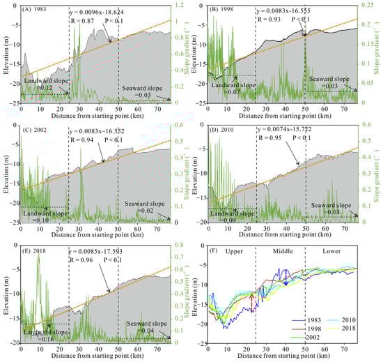 The longitudinal profile of the SCSP showed an antislope, steady channel during the past three decades. The average thalweg elevation in the SCSP was −11.32 m, −10.04 m, −10.26 m, −10.04 m, and −11.05 in 1983, 1998, 2002, 2010, and 2018, respectively. Concurrently, the average riverbed slope gradient of the SCSP was 0.09°, 0.04°, 0.06°, 0.06°, and 0.09° in 1983, 1998, 2002, 2010, and 2018, respectively. Compared with the seaward slopes (0.03°, 0.03°, 0.02°, 0.03°, and 0.04°) of the SCSP in the five years, the landward slopes were much greater (i.e., 0.12°, 0.07°, 0.1°, 0.09°, and 0.16°) (Figure 3A–E). The longitudinal changes of thalweg in the SCSP have undergone great changes during 1983–2018. These changes were mainly manifested in the substantial deposition in the upper sections of the SCSP with a maximum silt depth of ~ 7.5 m. Conversely, the largest riverbed degradation occurred in its middle reach which is 38–40 km from the starting point, specifically, a 3.9 m deepening from −6.2 m in 1983 to −10.1 m in 2018. However, the morphology of the thalweg in the lower reach exhibited no significant change compared with the upper or middle reaches in the SCSP (Figure 3F).