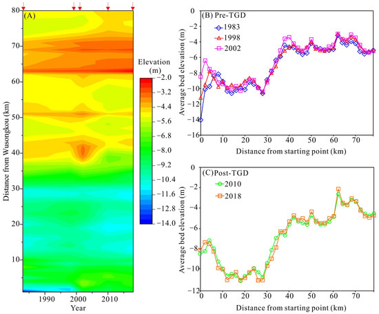 Spatiotemporal variation in bed elevation along the Yangtze estuary channel between 1983 and 2018. (A) 3D contour map. Red arrows correspond to the longitudinal profiles shown in panels (B,C). (B) Longitudinal profiles for different points in time before the closure of the Three Gorges Dam. (C) Longitudinal profiles for different points in time after the closure of the Three Gorges Dam.