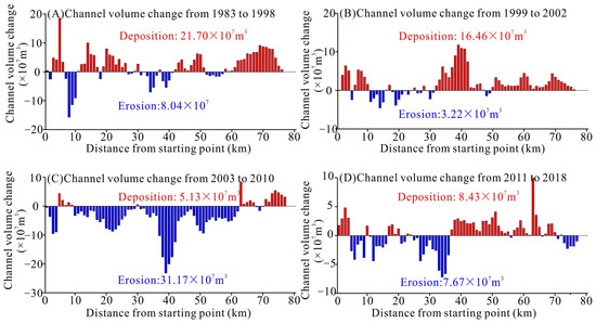 The SCSP channel dynamics over time. (A) Chanel volume change in the SCSP from 1983 to 1998. (B) Chanel volume change in the SCSP from 1998 to 2002. (C) Chanel volume change in the SCSP from 2002 to 2010. (D) Chanel volume change in the SCSP from 2010 to 2018.