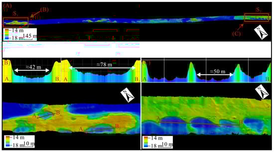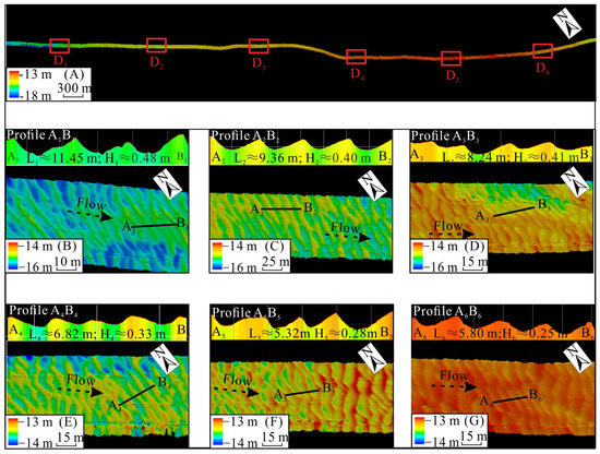 Our multibeam data show that dunes were the most common microtopography, accounting for 60.8% of the study area, while the flatbed accounts for approximately 35.6%. The rest is erosional topography (approximately 3.6%). Dune was the most widely developed riverbed micro-topography in the upper reach of SCSP. There is a dune group with a 7.5 km length in the upper reach of the SCSP (Figure 1C). The dune was well-developed in water depth between −11.8 m and −13.5 m. Small and medium dunes accounted for 99.2% of the dunes in the study reach (Figure 6B–G). In addition, scouring microtopography also was found and there is an amount of regular and oval regular sandpits located in the upper reach of the SC (Figure 1C). The multi-beam data showed that illegal sand mining holes are usually distributed on the margin of the navigation channel (Figure 7A). The length of the sandpit group is about 200 m, and they displayed an elliptical shape with a maximum diameter of 50 m and a maximum volume of 16 × 103 m3 (Figure 7B). These regular sandpits were about 1.8 m deeper than the surrounding bed surface (Figure 7B,C).
