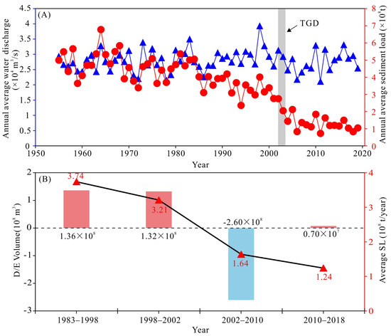 (A) Average annual discharge (left axis) and suspended sediment load (SSL) (right axis) at the Datong station from 1955 to 2018. (B) The correlation between the annual sediment load at Datong and the annual volume change in the SCSP. The long-term suspended sediment loads and river discharge were obtained from the Yangtze River Sediment Bulletin (published on http://www.cjh.com.cn, accessed on 1 January 2022). Note: TGD means the Three Gorges Dam.