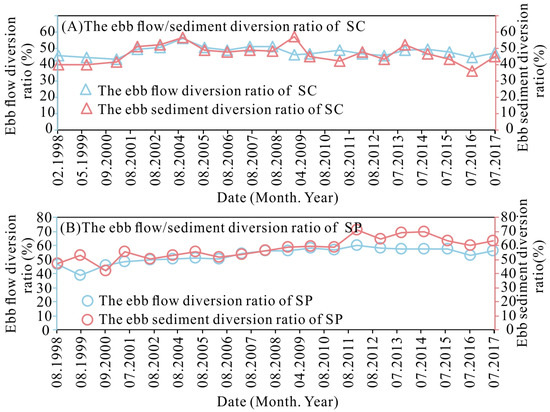 (A) Ebb flow/sediment diversion ratio of the SC during 1998–2017. (B) Ebb flow/sediment diversion ratio of the SP during 1998–2017. (Note: The data about the ebb flow/sediment diversion ratio of the SP during 1998–2017 were collected by the Changjiang Estuary Waterway Administration Bureau CJWAB).