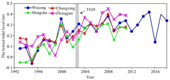 Annual lowest tidal level at Wusong, Changxing, Hengsha, and Zhongjun in the Yangtze River Estuary from 1992 to 2018). Note: the tidal level was obtained from Shanghai Municipal Oceanic Bureau (http://swj.sh.gov.cn/, accessed on 1 January 2022).