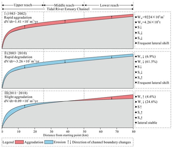 Deltaic channels present the final link of terrestrial sediment transport into the oceans, playing a significant role in coastal systems [6,7]. The geomorphic evolution of deltaic channels is of great significance in terms of infrastructure safety, navigation maintenance, and ecological service function. However, most of the world’s river deltas are at risk of sea levels rising and land subsidence [8]. Thus, the geomorphological dynamics and behavior of deltaic channels in response to dramatic climatic and anthropogenic stresses are receiving increased attention [9,10,11,12,13,14]. For example, sediment trapping in the Mississippi River basin has led to severe inundation of the delta plain and the loss of marsh habitat [15,16]. However, the Yellow River delta [17] and the Pearl River delta [18] in China converted to net erosion at the subaqueous deltas due to insufficient sediment supply and human activities. To maintain the erosion–deposition balance in the delta, a certain amount of fluvial sediment transport is required [19], and it has been reported that a portion of this supply is increasingly sourced by scouring from the upstream channel, given severe decreases in sediment caused by river damming [5,20]. Hence, some case studies of deltaic channels with the latest data are required to better understand the processes of geomorphic evolution under fluvial sediment decline and anthropogenic interferences.