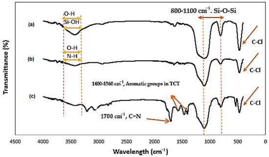 The FT-IR spectra of fumed-Pr-Cl, fumed-Pr-Pi, and fumed-Pr-Pi-TCT are shown in Figure 1. According to the FT-IR spectrum, the organic moieties bonded on the silica fume were proven. The two peaks at 1100 and 800 cm⁻¹ depend on the asymmetric stretching vibrations of Si-O-Si groups. The band was about 3420 cm⁻¹ and can also be considered to be related to the stretching O-H of Si-OH functional groups on the surface. The absorbance bands at 3431 and 1101 cm⁻¹ fit the stretching and bending of N-H in fumed-Pr-Pi, respectively [45]. Finally, the peak at 1700 cm⁻¹ is related to the C=N groups, and the peaks at 1560 to 1400 cm⁻¹ are also related to the aromatic groups in the TCT.