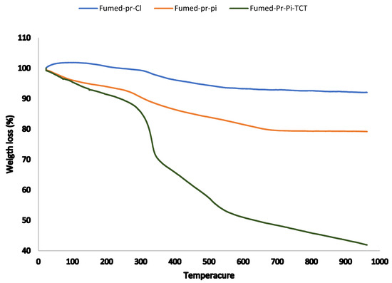 Thermogravimetric analysis (TGA) established the loading of organic compounds on the fumed silica (Figure 2). In the TGA diagram, two weight-loss steps were observed. The first weight loss, which occurred up to 200 °C, is related to the loss of H2O in the fumed silica cavities. Weight loss in the range 200–800 °C is related to the decomposition of existing organic components on the fumed silica. TGA curves indicated, respectively, the weight losses of organic compounds for 8% (fumed-PrCl), 17% (fumed-Pr-Pi), and 45% (Fumed-Pr-Pi-TCT), as predicated for materials with increasing loadings of organic content.