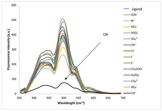 To investigate the fluorescence properties of fumed-Pr-Pi-TCT, its solution (0.02 g L−1) was made in an aqueous solvent. Then, its fluorescence response was studied using different anions, such as Br−, NO₃−, HSO₃−, SO₄²−, OH−, Cl−, I−, F−, CH₃COO−, H₂PO₄−, CO₃²−, NO₂−, SCN−, and CN−. By adding a 10−2 M concentration of different anions to 3 mL of fumed solution(0.2 g L−1), the spectra were recorded after 30 s. The fluorescence intensity of fumed-Pr–Pi-TCT decreased significantly after the addition of CN− but did not change significantly compared to that with other anions, which affirmed that this ligand could be applicable to detect CN− among other anions (Figure 4).