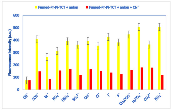 To evaluate the selectivity, a CN− competition test was performed against other anions. For this purpose, the spectra were recorded by adding anions (100 µL × 10⁻² M) to the mixture of fumed-Pr-Pi-TCT (3 mL H₂O suspension, 0.2 g L⁻¹) and CN⁻ (100 µL × 10⁻² M). The results presented in Figure 5 demonstrate that the CN− anion has high selectivity against other anions according to the fluorescence intensity.