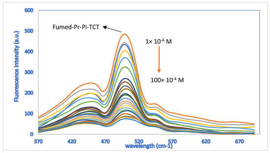 To evaluate the detection potential of this chemical sensor, a titration test was performed. For this purpose, diverse concentrations of CN− (1× 10⁻⁴ M to 100 × 10⁻⁴ M) were added to fumed-Pr-Pi-TCT. After each addition, the fluorescence spectrum was recorded. It gradually decreased after adding different amounts of anion (Figure 6).