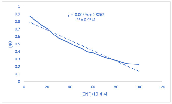 According to the titration diagram, the fluorescence intensity was reduced by adding CN−. By plotting the ratio of fluorescence intensity to different CN− concentrations (Figure 7), a linear relationship could be established between them that followed the equation y = −0.0069x + 0.8262, with a regression coefficient of R² = 0.9541. The DL = 3 Sd/m equation was used to calculate the detection limit (DL is the detection limit, Sd is the standard derivation of the blank, and m is the slope of fluorescence intensity) [46]. According to the above equation, the detection limit was obtained 0.82 × 10−4 M.