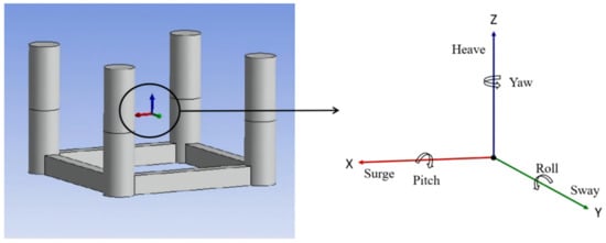 In this paper, various loads on floating tension-leg platforms, including wind load, wave load, and current sea load, were modelled by employing ANSYS 16.0-AQWA. The coordinate system and the degrees of freedom in six directions are shown in Figure 3. The angle between the tension leg and the vertical direction was defined as α (as shown in Figure 1c), and the tension legs were numbered L1–L8 (as mentioned in Section 2.1). The L1, L3, L5, and L7 tension legs remained unchanged, and the L2, L4, L6, and L8 tension legs’ vertical direction were changed by altering α.