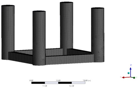 The whole domain description of the platform is illustrated in Figure 4, along with meshing details. The surface element model, excluding the tension legs, was meshed, and the mesh size was defined as 2 m, with 20,940 nodes and 21,032 elements.