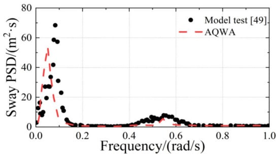 The floating TLP and tension legs have 6-DoF motion responses under environmental loads. The present numerical simulations were carried out using AQWA. The motion responses, including surge and sway under the same environmental loads, were compared to the references [,]. The square TLP in the references has four square columns and eight tendons. Notably, despite a few differences in geometry, the natural frequency of the AQWA model is close to that in the literature. In one study, the 1:40 scaling factor model test was reported by Gu et al. []. The significant height was 3 m and the significant period was 8.3 s. As shown in Figure 5, the model’s sway PSD was consistent with the trend in the literature. In a second study, another validation was conducted to compare the AQWA model and the numerical simulation carried out by Gu et al. []. The average current velocities at 0 m and 40 m depths are 1.08 m/s and 0.96 m/s, respectively. Furthermore, the average wind velocity at 10 m height is 12.6 m/s. With the increasing frequency, the surge PSD was basically the same as the previous results (Figure 6). However, the difference at the peak can be clearly captured. This may result from the discreteness of experimental results and the columns’ different shapes, masses, and so on. In general, the agreement showed the reliability of the present model and method in the simulation of the motion responses.