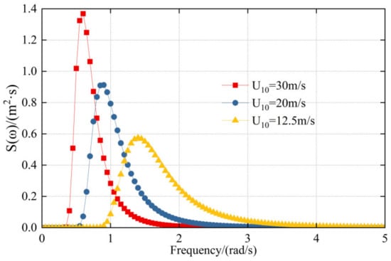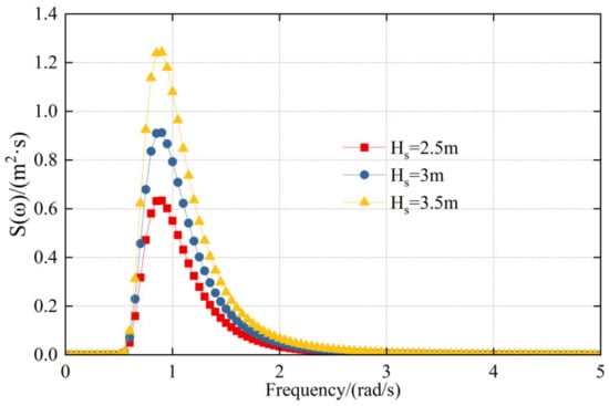 The spectral peak frequency corresponding to the significant wave height can be obtained by simulating the JONSWAP spectrum. The spectral peak factor can be evaluated by referring to the value range of different sea conditions (the JONSWAP spectrum applies to the North Sea, the Northern North sea, the Northern Atlantic, and others, with a range of 1~7. In this paper, the significant wave height is 2.5 m, so the spectral peak factor takes the value of 1.0). Figure 7 shows the wave spectrum when the significant wave height is 2.5 m, 3 m, and 3.5 m, respectively. Figure 8 outlines the change of peak frequency of the wave spectrum with the wind velocity. It can be concluded that the critical factor affecting peak frequency is the wind velocity at 10 m height on the sea surface.