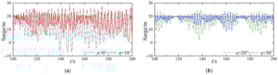Comparison of surge responses: (a) Motion responses of TLP when α = 0° and α = 10°; (b) Motion responses of TLP when α = 20° and α = 30°.