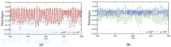 Comparison of pitch responses: (a) Motion responses of TLP when α = 0° and α = 10°; (b) Motion responses of TLP when α = 20° and α = 30°.