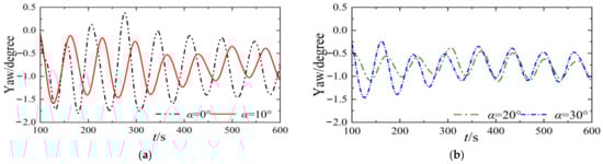 Comparison of yaw responses: (a) Motion responses of TLP when α = 0° and α = 10°; (b) Motion responses of TLP when α = 20° and α = 30°.