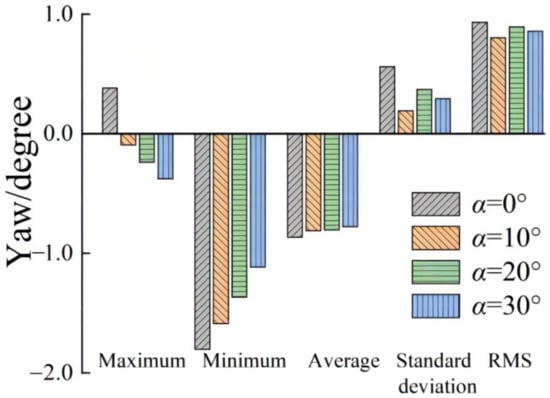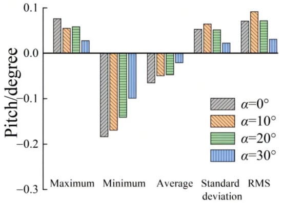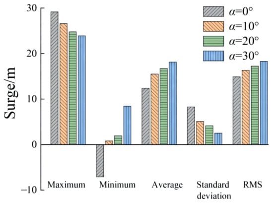 Table 4 shows the statistical values of the three responses under the same working condition, and Figure 12, Figure 13 and Figure 14 show those values’ histograms. The response with the most considerable value is selected to calculate the inhibition efficiency. We can see from the standard deviation that when α is small, the data fluctuation is generally large. The inhibition effect of increasing α on the motion response value fluctuation can also be judged via ƞ = |SD(30) − SD(0)|/SD(0) × 100% (where SD(0) and SD(30) are the standard deviations at 0° and 30°, respectively). It can be observed that the ƞ values are 69.48%, 57.22%, and 47.89%, respectively, for the surge, pitch, and yaw responses. Therefore, increasing α effectively inhibits large fluctuations of the platform, and the surge fluctuation is the best at α = 30°, which increases the platform’s safety.