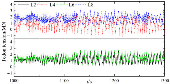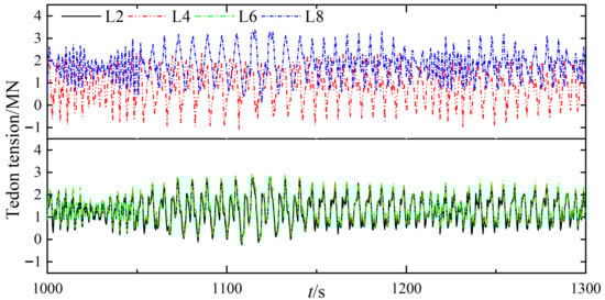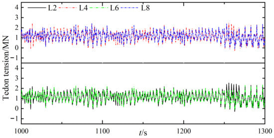 In Section 3.3 when α = 30°, the motion responses of the floating platform under environmental loads attain the minimum. This section discusses the influence of various loads on the tension of the tension legs when α = 30° by changing the combined working conditions of the environmental loads on the model, where the operating cases are C1~C4. Figure 15, Figure 16, Figure 17 and Figure 18, respectively, correspond to C1~C4 (C1 is under wind load only, C2 under wave load only, C3 under current load only, and C4 under all environmental loads). It can be seen that under C1, C2, and C4, the forces of the four tension legs are unbalanced. The tension of the L8 tension leg is the largest, while that of the L4 tension leg is the minimum value. For C3, the effect of the ocean current on the tension of the tension legs at different positions produces little difference, and the four curves fit well. Moreover, the maximum and minimum values occur for tension legs L8 and L4, respectively. By comparing the maximum and minimum values of C1~C4 and the curve fitting degree of L2, L4, L6, and L8, it can be estimated that wave load and wind load are the two main loads affecting the TLP’s motion performance.