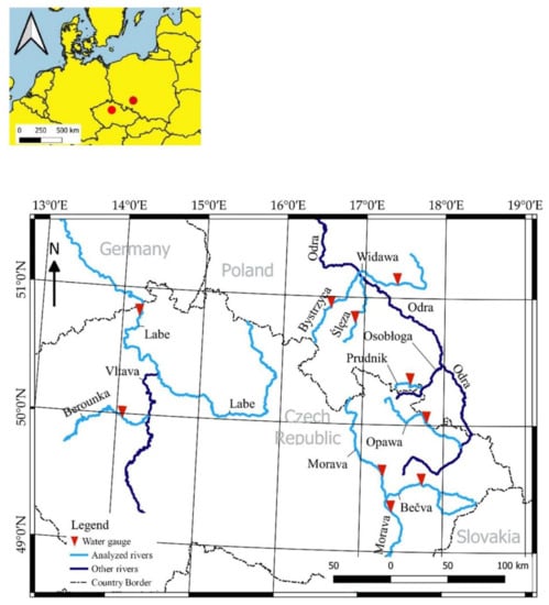 The rivers selected for the analysis, on the one hand, play an important role in the water management of both the Czech Republic and Poland, but on the other hand, they cause a flood risk. Reservoirs are planned on the rivers Labe, Morava, Becva, and on the tributaries of the Berounka River, on the Czech Republic side []. In turn, there are 12 existing reservoirs on the Morava tributaries, which are part of the water regulation works for flood protection. Moreover, the purpose of the reservoirs built in the 1960s–1970s is to supply both drinking water and service water []. Multifunctional reservoirs are planned on three of the five rivers (the Prudnik, Ślęza, Bystrzyca) near the gauging station, on the Polish side [,,,]. Lastly, on the Widawa River, there is a multifunctional reservoir []. The Opawa river was chosen because of the flood protection in its valley.