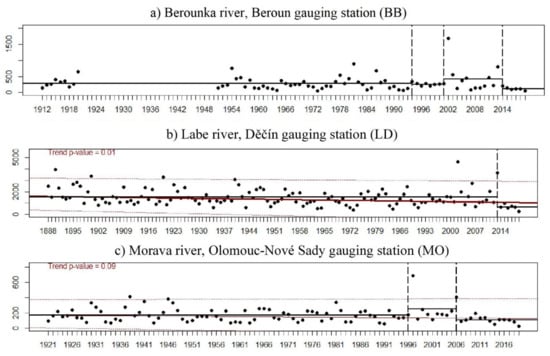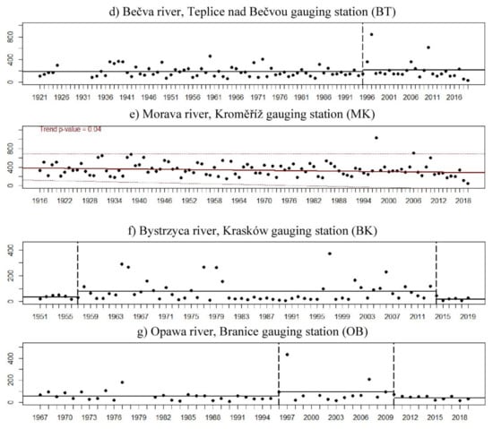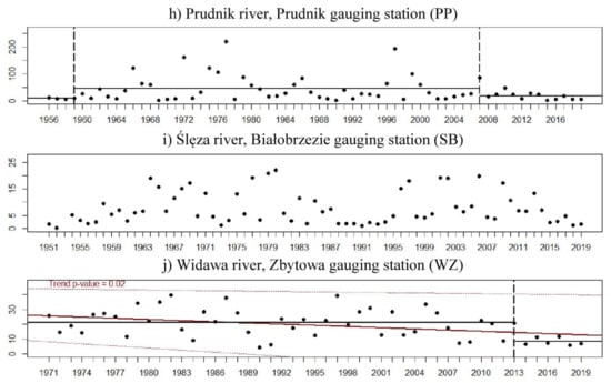 Change points and trend for investigated data series: (a) Berounka river, Beroun gauging station (BB), (b) Labe river, Děčín gauging station (LD), (c) Morava river, Olomouc-Nové Sady gauging station (MO), (d) Bečva river, Teplice nad Bečvou gauging station (BT), (e) Morava river, Kroměříž gauging station (MK), (f) Bystrzyca river, Krasków gauging station (BK), (g) Opawa river, Branice gauging station (OB), (h) Prudnik river, Prudnik gauging station (PP), (i) Ślęza river, Białobrzezie gauging station (SB), (j) Widawa river, Zbytowa gauging station (WZ).