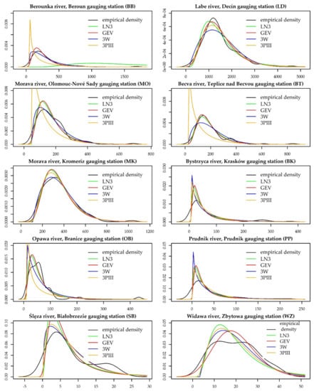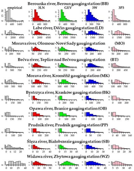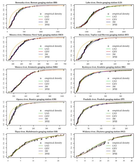 Both in the territory of the Czech Republic (in the Vltava and Morava basins) and Poland (in the Upper Oder basin), studies of simple distributions have been few and far between. The research does not cover all the available stations in Poland, especially in the area of the Upper Odra basin []. Recently, in 2008, in the research area, studies of three-parameter Log-Normal and two-parameter distributions such as the Log-Normal, Gumbel, and Fechet distribution were used for the Vltava river, Prague station []. Later, only two-parameter distributions such as the Log-Normal, Log-Pearson III, Gumbel, and Fechet were tested. The latter two distributions did not seem to fit well with the empirical data []. Moreover, the Annual Maxima method and the GEV distribution were used for individual stations of the Morava river [] and for the Elbe river, Litoměřice station []. The data series consisted of maximum annual water levels [] and maximum annual flows []. For some of the rivers in the Upper Odra basin, including the Widawa in the Zbytowa profile, researchers used single distributions such as 2P2, 2LN, and GEV []. In turn, for the Bezimienny Potok (Minkovický Potok) located on the Polish-Czech border, researchers used Pearson Type III with the MLE []. In Poland, there were more studies of single distributions in the Vistula basin [,,,,,].