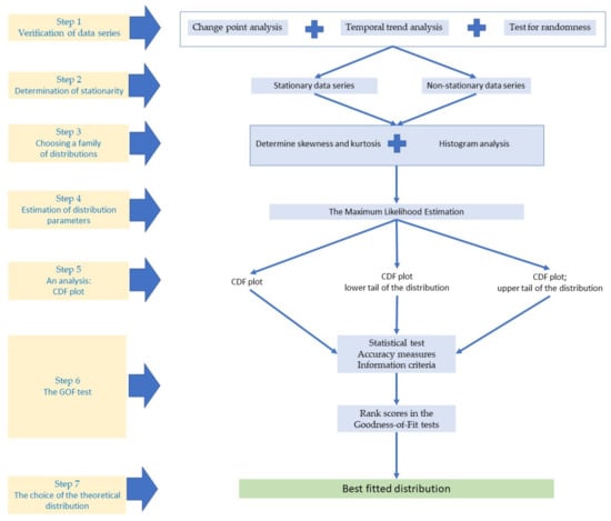 Selection of the optimal estimated parameters of the distribution requires prior verification of the data series. The following verification methods were used in the present study: change point analysis, temporal trend analysis, test for randomness. Similar methods were used in other research [,,]. Some researchers used only one method []. Other researchers assumed that all the data series were not homogeneous [].