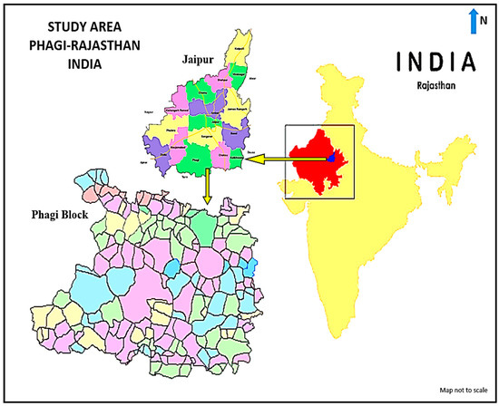 The research area for this particular study covers Phagi Block, located in the southwestern region of Jaipur district, in the state of Rajasthan (India) located between latitudes 26°30′22″ N to 26°43′15″ N and longitudes 75°23′56″ to 75°42′35″ E. It is surrounded in the South by Tonk district and occupies an area of 146,790 ha (Figure 1). The region has a mild slope with clay loam soil and semi-arid topography. The region has high relative temperatures throughout the year with dry arid weather conditions. The average annual precipitation is around 640 mm with summer maximum which makes availability of surface water shorter and existence of non-perennial river systems. Due to scarce availability of surface water, more than 50% of the people in the region rely on groundwater resources for their needs [24,25,26]. However, with degrading water sources, the predominance of water borne diseases can be observed in the region [27,28]. Two parameters (Fluoride and Total Dissolved Solids) were found to have an increase in concentrations, due to which study area is more prone to diseases like fluorosis and gastroenteritis. The concentration of the elements in drinking water has been assessed as per the permissible limits set by the Bureau of Indian Standards (BIS,10500-2003) [29].