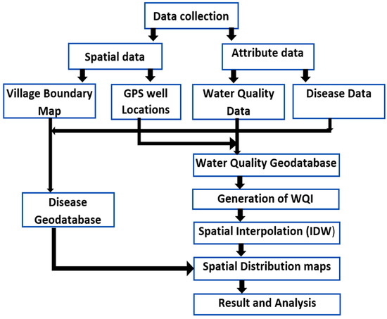Epidemiological data focusing on gastroenteritis and fluorosis have been collected from ‘Patient Record form’ available at 5 (five) primary Health centers (PHC) located in the assessment area namely—Phagi, Madhorajpura, Chauru, Renwal, Nimera PHCs. In addition, 8–12 villages in the area were served by each PHC; therefore, all the villages under one PHC were dissolved to form a single polygon conforming the service area of the respective PHC in the selected study region. Therefore, the (PHC’s) are depicted by 5 polygons—Phagi, Madhorajpur, Chauru, Renwal, Nimera—in the region while showcasing disease prevalence of fluorosis and Gastroenteritis diseases. The chemical concentrations of the entire sample lying in a PHC have been averaged and association between specific disease incidence and level of relevant physio-chemical parameters in the groundwater have been quantified using correlation and linear regression analysis. The overall methodological design adopted for the research is represented in the flow diagram in Figure 3.