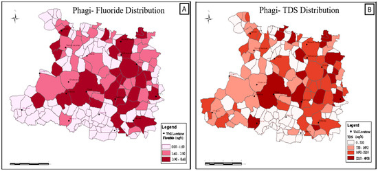 - Fluoride (F−): Fluoride is a monatomic anion found naturally in water with the chemical formula F⁻. Fluoride is primarily sourced from water in the human diet. Therefore, much of the difference in total fluoride intake is dependent on the compositional variability of water [47]. The existence of fluoride in groundwater is generally dissolved from geological formation [48]. While excessive intake of fluoride is often associated with dental fluorosis, excessive exposure to fluoride may lead to crippled skeletal fluorosis [49]. However, in the case of fluoride, the excess and deficiency both can be detrimental to human health; therefore, its optimum consumption is essential for balanced growth. The optimal intake of fluoride accepted widely ranges from 0.05 to 0.07 mg/kg of the total body weight [50]. It was observed that the Phagi region has an overall higher concentration of fluoride, which ranged between 1.66 to 8.60 mg/L, and was way above the BSI prescribed standards (fluoride 1.0 mg/L) for drinking water in India. The fluoride concentration was highest in the Central and North Eastern region with more than a 3.90 mg/L concentration. More than 70% of the study area is badly affected by fluoride in drinking water (Figure 4A).