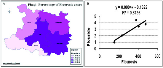 Percentage of Fluorosis cases recorded. (A) linear regression analysis between fluorosis cases and fluoride content in water (B).