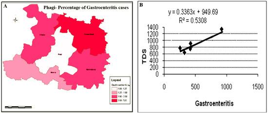 Percentage gastroenteritis incidences cases recorded (A); linear regression analysis between gastroenteritis cases and TDS content in water (B).