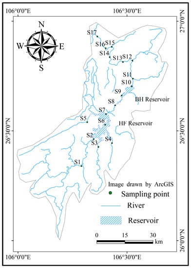 In July, August, and November 2020, three sets of samples from 17 locations (S1–S17) were collected (Figure 1). Samples were collected 0.5 m below the water’s surface; locations were recorded by a global satellite positioning system (G1388D). Three parallel samples were collected at each sampling location: (a) samples for heavy metal analyses; (b) samples for nutrient analyses; (c) samples for chlorophyll-a analyses. Samples for heavy metal analyses were treated with analytical grade nitric acid (HNO3) immediately after collection to decrease the pH to ≤2: Samples for nutrient and chlorophyll-a analyses were not treated with chemicals but immediately placed in a dark cold box (c. 4 °C) for storage and transportation. In the laboratory, samples were stored in a refrigerator at 4 °C. Samples were analyzed within 48 after collection. The samples for heavy metal analyses were filtered through a 0.45 μm membrane filter. Determination of Pb, Ni, and Cu was performed using a flame atomic absorption spectrometer (ZEEnit 7001, Analytical Instruments in Jena, Germany), and a graphite furnace atomic absorption spectrometer (ZEEnit 7001) was used to measure As and Hg. Samples for chlorophyll-a were filtered through a cellulose filter. The amount of filtered volume was recorded. Filters were stored in glass vials with acetone for further analyses. Afterwards, the concentrations were determined by colorimetric methods using UV spectrophotometry at 750, 664, 647, and 630 nm. Samples for total nitrogen (TN) and total phosphorus (TP) were collected unfiltered, whereas those for nitrate (NO3−), nitrite (NO2−), ammonium (NH3-N), and orthophosphate (PO43−) were pre-filtered through membrane filters (0.45 μm). Chemical oxygen demand (CODMn) was measured by potassium permanganate oxidation method, and the five-day biological oxygen demand (BOD5) was measured via dilution and inoculation method. All analyses followed standard methods [30]. Prior to each set of analyses, standards with known concentrations of the parameters in question, provided by the National Standards Center, were analyzed to verify accuracy of the instruments and analytical processes. Chemical and biological parameters were analyzed by means of software programs Excel 2019, SPSS 23.0, ArcGIS 10.8, and Origin 2021.