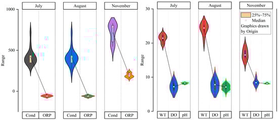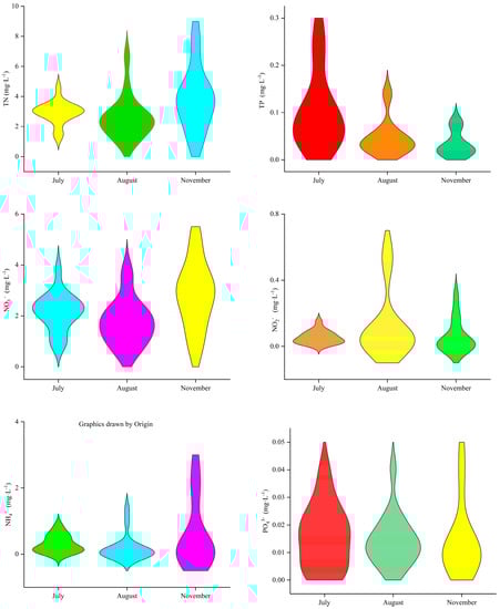 The temporal and spatial changes in dissolved oxygen (DO), electric conductivity (Cond.), oxidation–reduction potential (ORP), water temperature (WT), and pH during the study period in the Maotiao River Basin are shown in Figure 2. The average concentration of DO in the surface stratum increased from 7.2 mg·L−1 (July) to 8.4 mg·L−1 (November). The average EC values ranged from 415 to 830 μs·cm−1. In the summer, with a low-water level, values decreased in the direction of waterflow. The minimum value was 235 μs·cm−1 (location S10), and the maximum was 718 μs·cm−1 (location S2). In autumn, the EC trend was in the opposite direction. The minimum value was 546 μs·cm−1 (location S1), and the maximum value was 830 μS·cm−1 (location S14). pH values were relatively stable in July and November, and varied from 7.92 to 8.50 (i.e., slightly alkaline), but values fluctuated considerably in August, when the coefficient of variation was 11.96% and values ranged from acidic (pH5.32 at location S10) to alkaline (pH 8.50 at location S8). In summer, the ORP ranged from −77.8 to −43.5 mv, and the minimum was observed in location S9. However, as the redox conditions of the water in autumn underwent significant changes, the ORP ranged from 157.4 to 234.6 mv, and the water body showed notable oxidation characteristics.