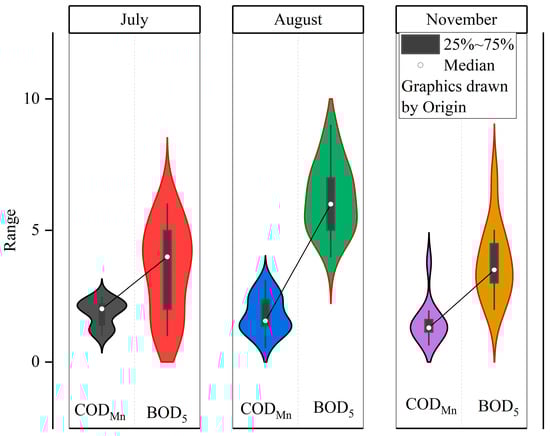 In order to increase yield, chemical fertilizers and pesticides are widely used in agriculture, which increase the concentrations of N, P, and heavy metals in water bodies and cause the deterioration of water quality. As example of an indicator of water quality is BOD5, which is among the standard parameters correlated with eutrophication (presence of T and P compounds). According to China’s surface water environmental quality standard (GB3838-2002), in July, the BOD5 values were <3.0 mg·L−1—water quality Class II—in 12 (out of 17) locations; and five locations, where values ranged from 4.0 to 6.0 mg·L−1, belonged to water quality Class IV. In August, watery quality decreased, as seven locations (S1, S3, S4, S9, S10, S13, S14) moved to water quality Class V, representing 41.18% of the total number of sampling points.
