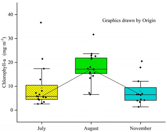 The chlorophyll-a concentration indicated a seasonal trend (Figure 5). It increased in summer and decreased in autumn, and the increase of primary producers (i.e., unicellular algae and their colonies and macrophytes) in the reservoirs was considerably higher than in the rivers. The maximum concentration of chlorophyll-a (Chl-a) was found in summer at location S7 (36.7 mg·m−3), whereas the minimum was at location S14 (1.4 mg·m−3) in November.