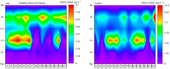 Arsenic (As), chromium (Cr), copper (Cu), mercury (Hg), nickel (Ni), and lead (Pb) had evident temporal and spatial distribution dynamics (Figure 6). The concentration of Hg varied from below the LoD to 0.03 μg·L−1. The average concentration was 0.01 μg·L−1. The lowest concentration was found in August (location S17) and the highest in July (location S4). The As concentration varied from 0.22 to 2.38 μg·L−1. The average concentration was 1.12 μg·L−1. The minimum concentration was found in July (location S2), and the maximum concentration was found in August (location S17). The Cr concentration varied from LoD to 9.78 μg·L−1. The average concentration was 5.07 μg·L−1. The Cu concentration varied from 0.80 to 4.87 μg·L−1. The average concentration was 2.81 μg·L−1. The maximum and minimum values were in July at locations S9 and S6, respectively. The Ni concentration varied from 3.46 to15.36 μg·L−1. The average concentration was 5.84 μg·L−1. The maximum and minimum values were in August at locations S10 and S17, respectively. The Pb concentration varied from 0.07 to 0.24 μg·L−1. The average concentration was 0.16 μg·L−1. The maximum and minimum values were found in July at locations S8 and S2, respectively.