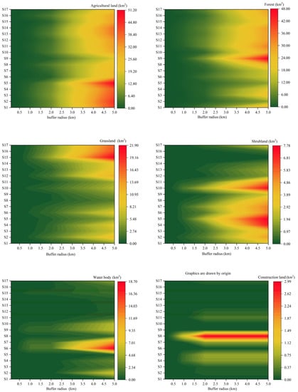 Among the types of landscape in the Maotiao River Basin, the agricultural area was the largest, and accounted for 49.74% of the total watershed area, followed by forest (26.31%), grassland (9.68%), and urban (7.01%) areas (Figure 7). Shrublands and water bodies were the smallest, accounting for 5.38% and 1.69%, respectively. As the buffer zone area increased, as strips of land around the water bodies, from 100 m (a standard distance) to 5 km (this study), the proportion of agricultural areas in the buffer zone increased from 22.8% to 44.8%, and that of forest increased from 15.03% to 33.00%. The proportions of shrubland and urban areas reached their maxima when the buffer zone was set at 900 m, which were 6.30% and 3.10%, respectively. The proportions of grassland and water continued to decrease, indicating that as the river buffer zone increasesd, the types of land use also changed significantly, and the landscape pattern underwent significant changes. Meanwhile, urban areas along the Maotiao River are primarily concentrated near locations S8 and S9, respectively, and are relatively far from the river. From the perspective of spatial changes in land use structures, with the expansion of the buffer zone, human activity in the Maotiao River Basin has gradually increased.