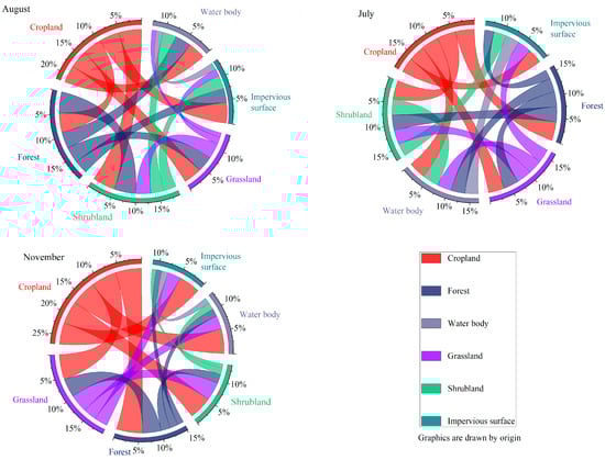 The interactions among agricultural areas and forests, shrubs, and water bodies exceeded 0.90 in July, showing bivariate or nonlinear enhancement (Figure 10). The interactions were far greater than the impact of a single factor. In August, the interaction intensities of shrubland and cultivated land, and arable land and woodland, were 0.98 and 0.91, showing bivariate enhancement and nonlinear enhancement, respectively. The interaction intensities in autumn of arable land and forest; grassland and cultivated land; and water body and cultivated land were 0.999, 0.96, and 0.94, respectively, all showing bivariate enhancement.