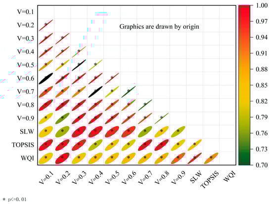 To verify the applicability of the fuzzy matter-element-VIKOR model (FME-VIKOR model) and discuss the stability of the decision result when the decision coefficient V changes, we set the coefficient V to be within an interval of 0.1. For different decision coefficients, the ranking below was analyzed by Spearman correlation and compared with the simple linear weighted (SLW), Technique for Order Preference by Similarity to an Ideal Solution (TOPSIS), and water quality index (WQI).