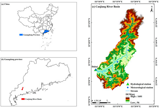 Location of (a) Guangdong Province, (b) the Caojiang River Basin (CRB), and (c) related hydrological and meteorological stations.