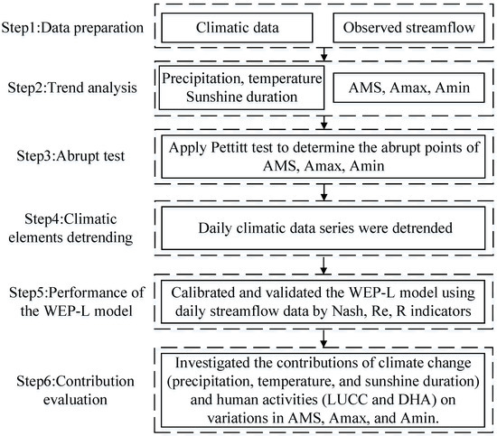 First, we applied the Pettitt test to determine the abrupt points of AMS, Amax, and Amin. The study period (1967–2018) was divided into a baseline and a variation period. Second, we used the daily observed streamflow data to calibrate and validate the WEP–L model. Third, we combined the different scenarios with the WEP–L model to simulate the streamflow for each scenario. Fourth, we investigated the contributions of climate variability (precipitation, temperature, and sunshine duration) and anthropogenic activities (LUCC and DHA) to variations in AMS, Amax, and Amin. The framework of the implemented methodology is shown in Figure 2.