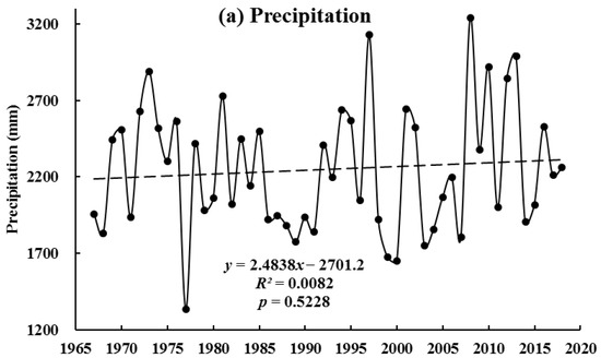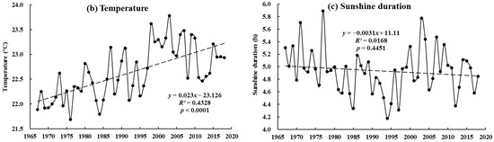 Temporal variations in (a) precipitation, (b) temperature, and (c) sunshine duration in the Caojiang River Basin (CRB) from 1967–2018. The dotted line is the trend line.