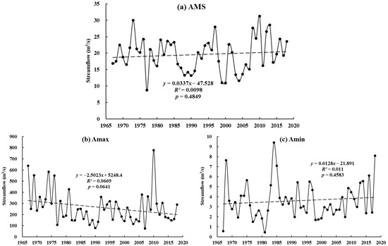 Temporal variations in (a) annual mean streamflow (AMS), (b) annual maximum streamflow (Amax), and (c) annual minimum streamflow (Amin) in the Caojiang River Basin (CRB) from 1967–2018. The dotted line is the trend line.